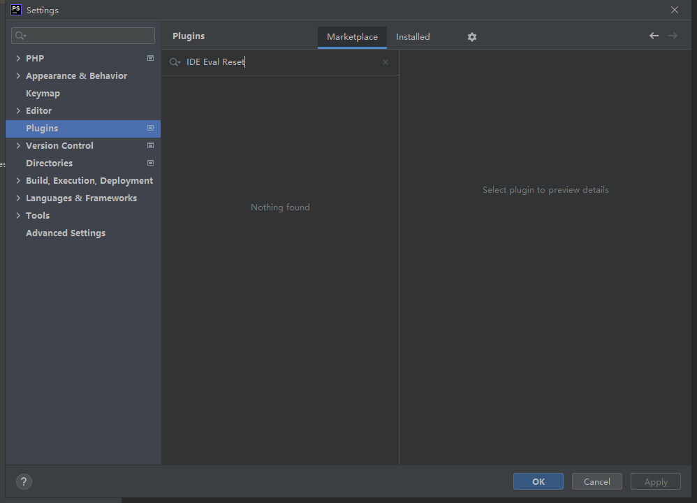 然后找到 Plugins 項(xiàng)點(diǎn)擊 Marketplace 項(xiàng)直接搜索 IDE Eval Reset 無限 jetbrains 試用擴(kuò)展