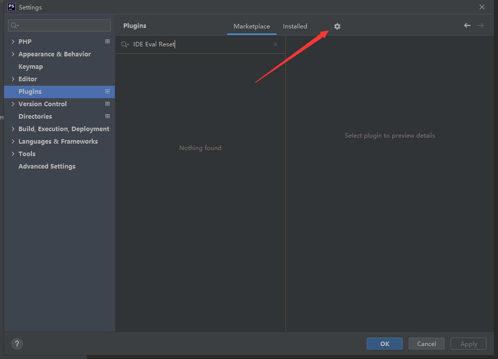 我們發(fā)現(xiàn)并沒有搜索到,這時因?yàn)?IDE Eval Reset 無限 jetbrains 試用擴(kuò)展并不是官方收錄的插件,這個時候我們只需要在右邊齒輪圖標(biāo)位置配置下第三方插件源即可